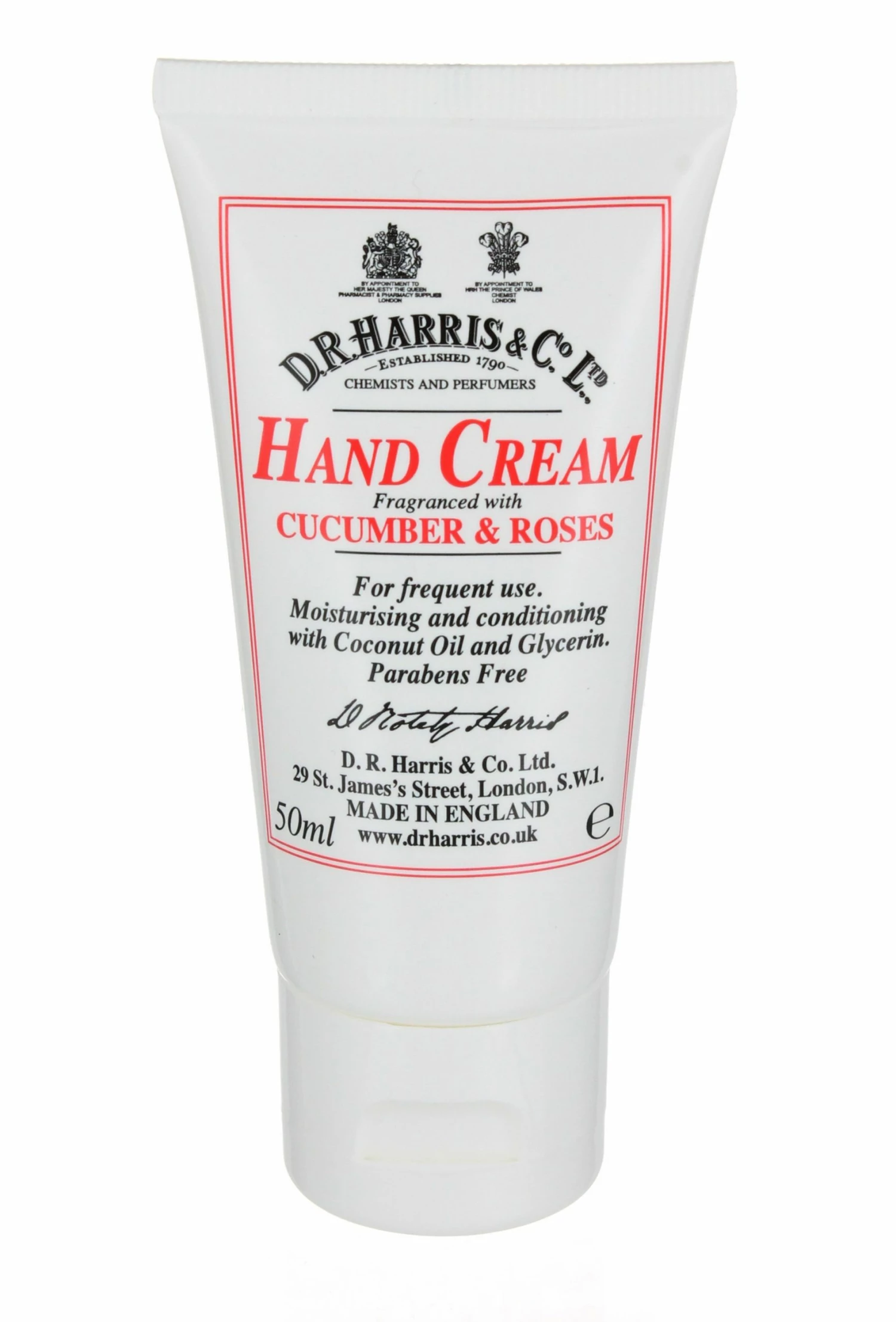 A hand cream scented with Cucumber and Roses fragrance. This formulation is moisturising and conditioning without leaving the hands greasy or sticky. Our formulation is parabens free and contains coconut oil. Use frequently to protect and condition. The 50ml size means this will become a desk or hand bag favourite in no time.